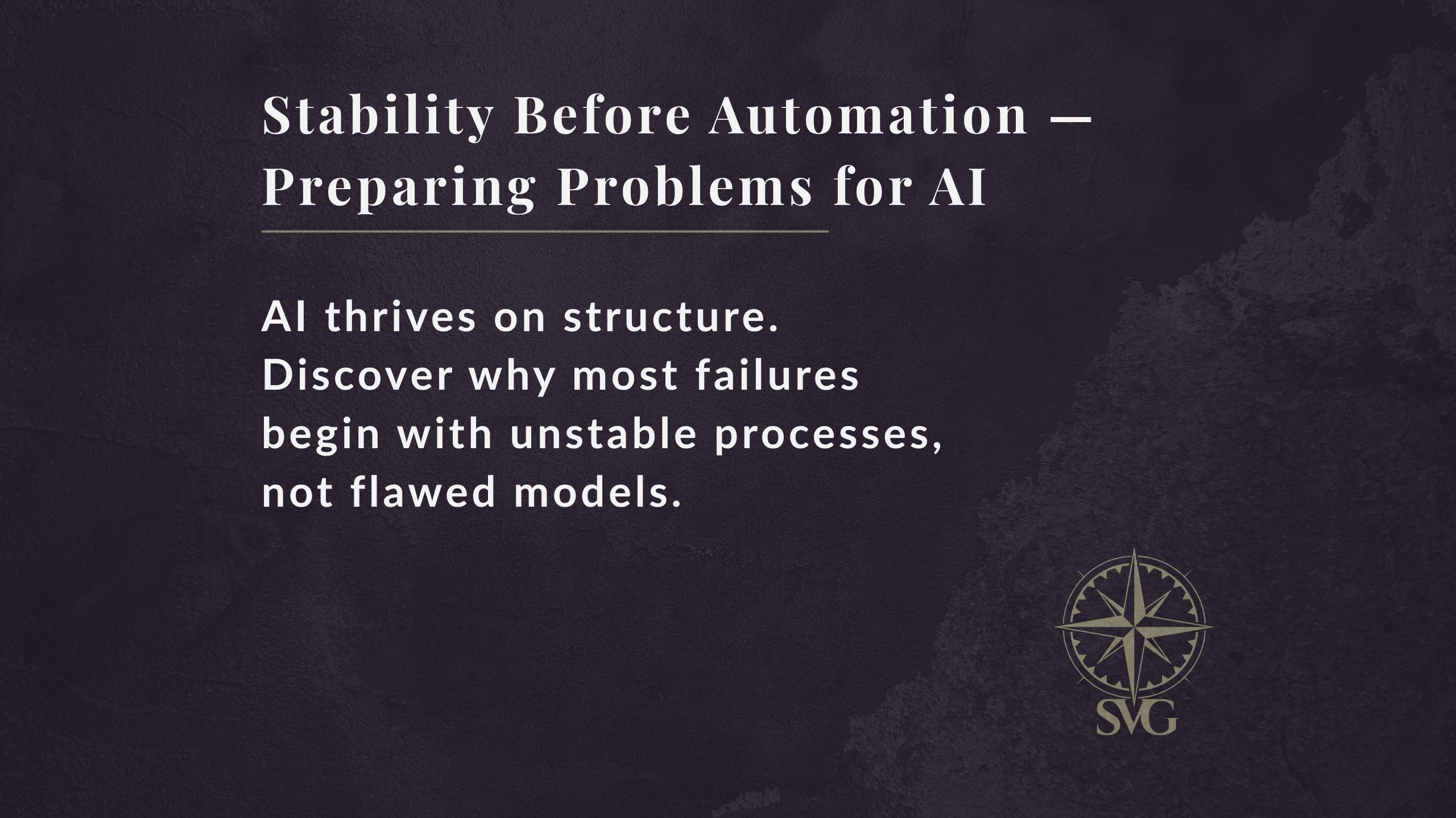 Before AI can solve a problem, the problem itself must be structured for success. We help organizations design the policies, standards, and data frameworks that turn messy, moving targets into stable, solvable systems—so your AI performs reliably from day one.